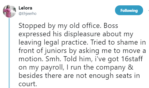 A Nigerian lady has taken to Twitter to narrate how her ex-boss tried to shame her for abandoning the legal profession to pursue a career in hospitality. The lady trained as a lawyer and practiced for a while at her former company. She resigned to open a bar which has made her fulfilled and increased her financial worth. Read her encounter with her ex-boss and colleagues after she stopped by her former company below.