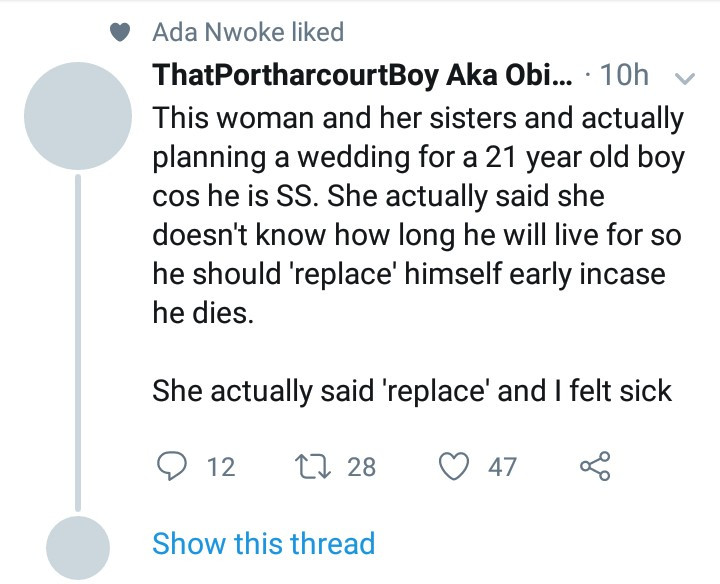 A Twitter user has alleged that a 21-year-old boy is being forced to marry because he has the SS genotype, and this has angered Twitter users. The family of the boy allegedly fear that he may not live long due to his ailment so they have found a girl with the AA genotype and are trying to get him to marry her so he can have a child to succeed him. A number of Twitter users condemned this action while some have said it's common in Nigeria and parents do this for young men who are only sons or have the SS genotype. Read tweets below.