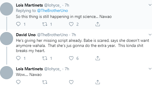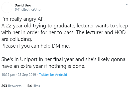 A Twitter user has taken to the platform to ask for help while accusing a University lecturer and HOD colluding to prevent a 22-year-old final year student from graduating, except she has sex with the lecturer for marks. According to @TheBrotherUno, the lecturer and HOD are both in the "faculty of management science". He said the lecturer is already making the girl have missing scripts and he's asking that anyone who can help sends a DM, so the student isn't prevented from graduating. He tweeted:I'm really angry AF. A 22 year old trying to graduate, lecturer wants to sleep with her in order for her to pass. The lecturer and HOD are colluding. Please if you can help DM me. She's in Uniport in her final year and she's likely gonna have an extra year if nothing is done.