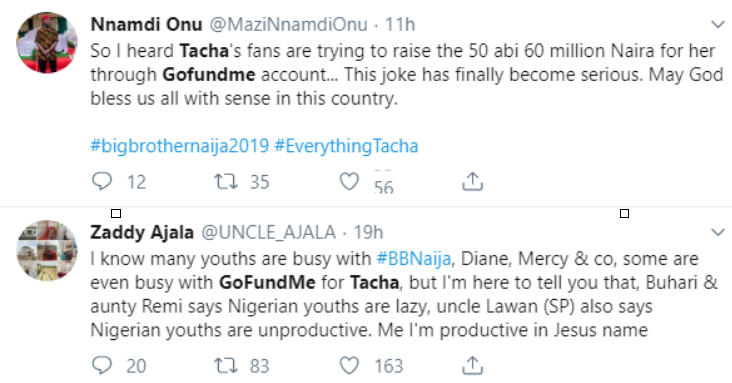Nigerians on Twitter are reacting to the surprise move of those raising funds through 'GoFundMe' for Big Brother Naija disqualified housemate, Tacha. While many disapprove of the move saying it is 'dumb', others especially Tacha fans have stated that they won't they won't back down until they reach the 50million naira goal.See some Twitter reactions below.
