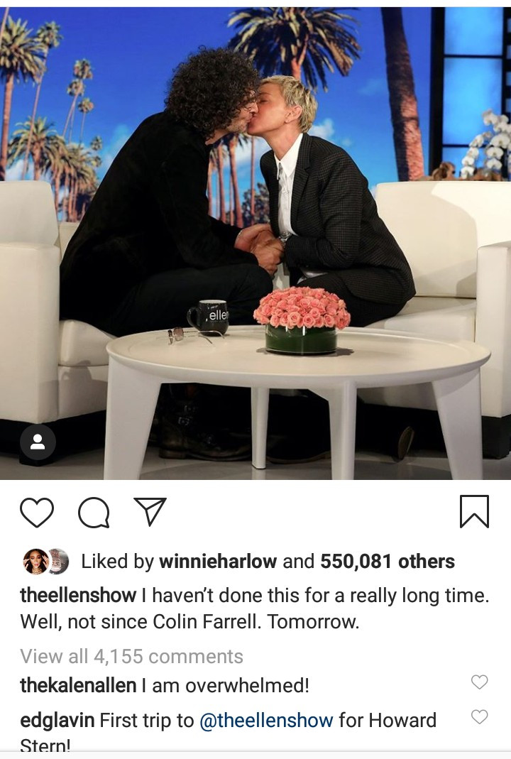 Howard Stern and Ellen DeGeneres shared a kiss on the Ellen DeGeneres Show. It was Howard's inaugural “Ellen DeGeneres Show” appearance and, during the interview, the show host and her guest locked lips. But that isn't all that happened on the show which will air today. Stern went ahead to renew his vows with wife Beth, as TV personality, Colton Underwood oversees the proceedings. Sharing a photo of the kiss, Ellen wrote: "I haven't done this for a really long time. Well, not since Colin Farrell."