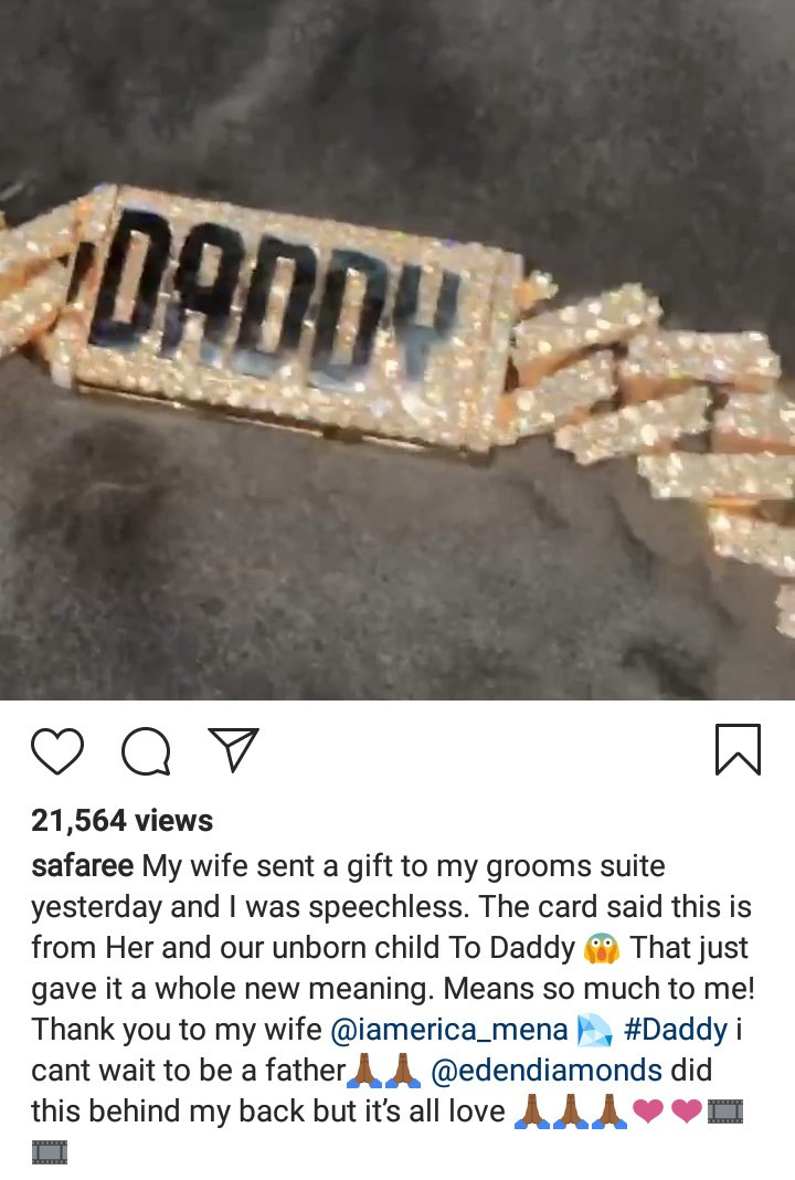 Sharing a video of his wedding gift, he wrote: "My wife sent a gift to my grooms suite yesterday and I was speechless. The card said this is from Her and our unborn child To Daddy. That just gave it a whole new meaning. Means so much to me! Thank you to my wife @iamerica_mena #Daddy i cant wait to be a father @edendiamonds did this behind my back but it’s all love"