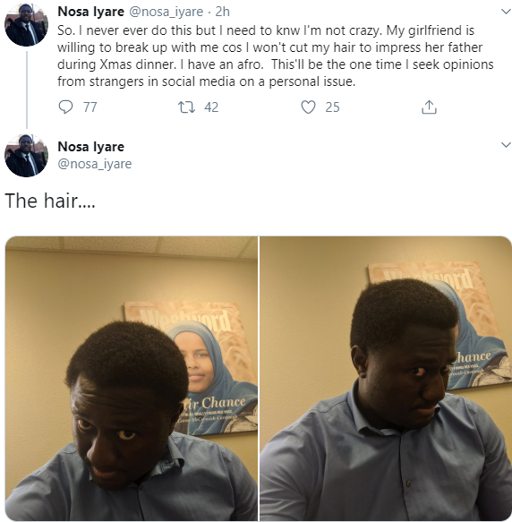 Nigerian man seeks advice after his girlfriend threatened to call off their relationship because he refused to cut his Afro to impress her father
