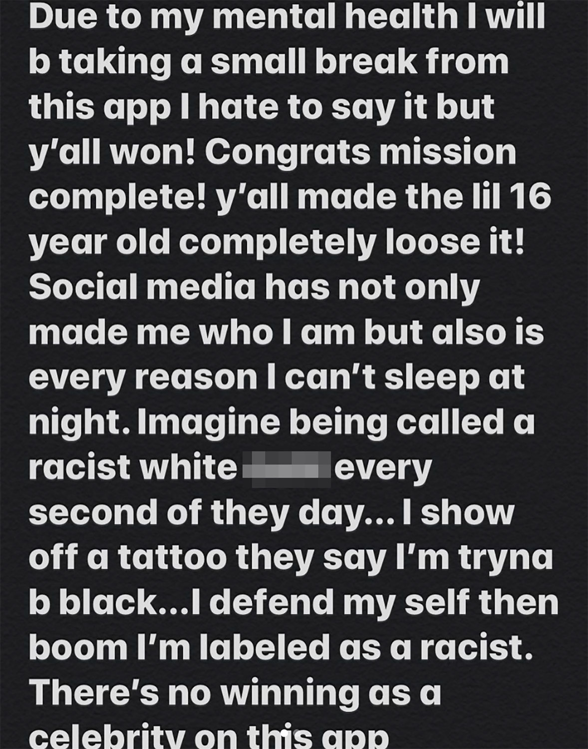 Bhad Bhabie is taking a 'small' break from Instagram for her “mental health.” The 16-year-old rapper made the announcement in a since-deleted post on the social media platform, explaining that “There’s no winning as a celebrity on this app.” "Due to my mental health I will b taking a small break from this app I hate to say it but y'all won," "Congrats mission complete! y'all made the lil 16 year old completely loose it! Social media has not only made me but also is every reason I can't sleep at night. Imagine being called a racist white c*nt every second of they day... I show off a tattoo they say I'm tryna b black... I defend my self then boom I'm labelled as a racist. There's no winning as a celebrity on this app everything I do will b considered wrong."