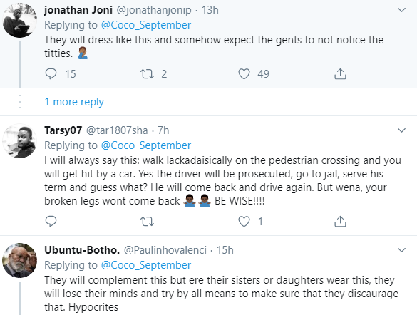 @Tar1807sha tweeted: "I will always say this: walk lackadaisically on the pedestrian crossing and you will get hit by a car. Yes the driver will be prosecuted, go to jail, serve his term and guess what? He will come back and drive again. But wena, your broken legs wont come back." @StevenMacatsha commented: "Boobs aren't meant to be sexualised. In pre colonial African women used to show them. I think it's cool that you're breaking 'norms' of this world we're living in today. Nice boobs though..." @Polite_Yelwa said: "Call me whatever but this is perverted. If men were to free any of their body parts that are sexually lucrative to the other gender it would be a huge offence. But when its this gender it's freedom of expression. Men continue to be oppressed as women seek to be liberated." Read more comments below and tell which side you're on.