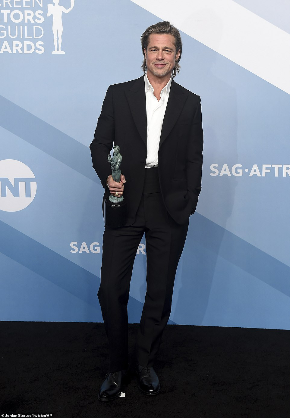 In his acceptance speech, Pitt poked fun at his being single. ' I have to add this to my Tinder profile,' the actor said as he held the statue. 'Thank you, my brothers, my sisters. This means so much. More than I can possibly fathom. I want you to know I watch everything. I watch you all, and the work has been mesmerizing. So I thank you.'