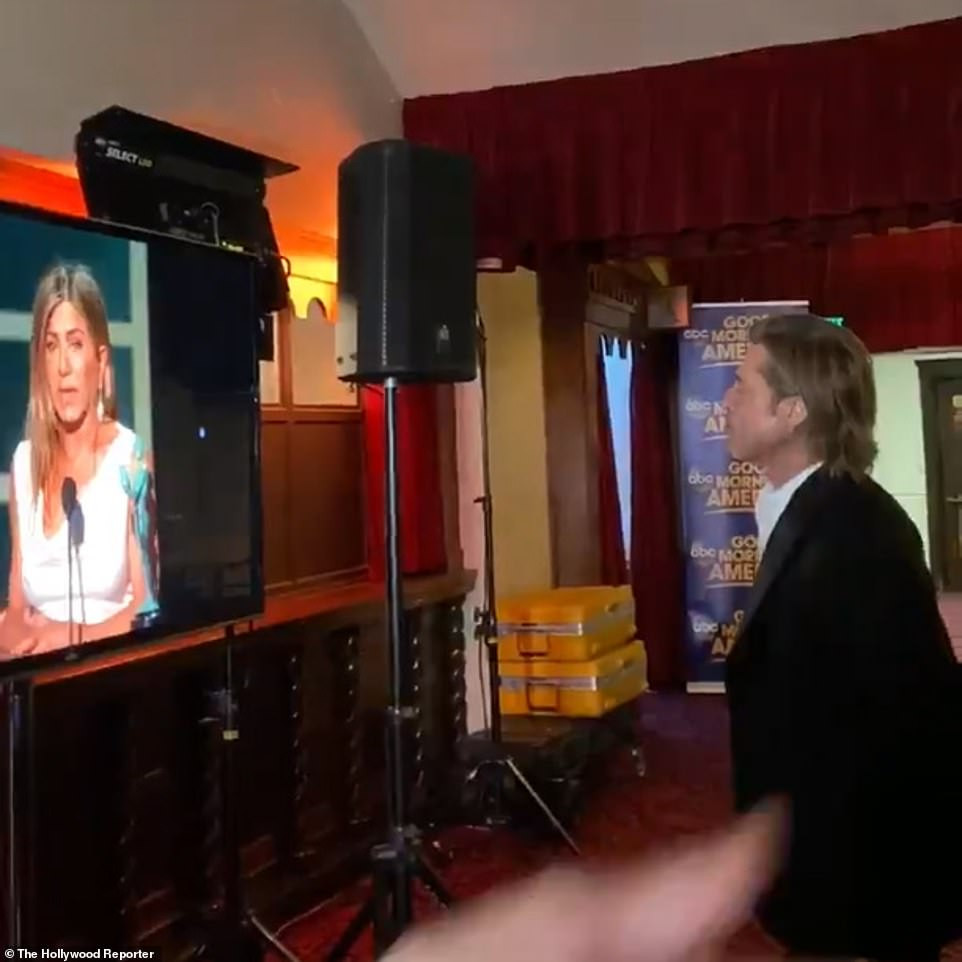 'I want to thank my co-stars, Leo [DiCaprio], Margot Robbie, Margot Robbie's feet,' Pitt said. Moments later, Aniston received her own statue, winning for best actress in a drama and Pitt was filmed watching his ex-wife on a television screen backstage as she gave her own acceptance speech.