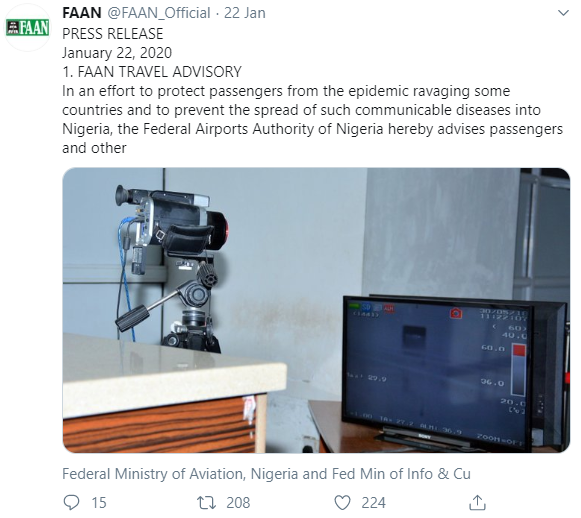 The Federal Airports Authority of Nigeria (FAAN) has announced the measures they are taking to ensure that the deadly Coronavirus does not make its way into Nigeria. They also advised Nigerians on what to do to be of help. FAAN explained that thermal scanners and other equipment and personnel used in combating the deadly Ebola virus in 2014 "are still very much in place at the airports." They advised Nigerians coming into the country to "submit themselves for routine quarantine checks whenever they are asked to" in order to prevent the spread of the disease. FAAN added that "the Authority, in collaboration with the Federal Ministry of Health, have confirmed the adequacy of the facilities at the nation's airports to prevent the importation of the virus through the airports." Read the tweets shared by FAAN below.