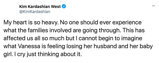 Alongside Kobe, 41, was his daughter Gianna, 13, and 7 others and Kim, a mother of four, wrote in a message that her ‘heart is so heavy’ she couldn’t ‘imagine’ what Vanessa, wife to Kobe Bryant is going through. Kim Kardashian, 39, posting on her Twitter and Instagram accounts: “My heart is so heavy. No one should ever experience what the families involved are going through. This has affected us all so much but I cannot begin to imagine what Vanessa is feeling losing her husband and her baby girl. I cry just thinking about it.”