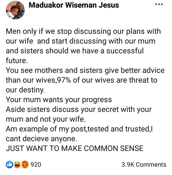 A man has advised men to discuss their plans with their mothers or sisters, rather than with their wives, if they want to succeed. Giving men his recipe for success, Maduakor Wiseman wrote on Facebook: "Men only if we stop discussing our plans with our wife and start discussing with our mum and sisters should we have a successful future.'' "You see mothers and sisters give better advice than our wives,97% of our wives are threat to our destiny."Your mum wants your progress. Aside sisters discuss your secret with your mum and not your wife. "Am example of my post,tested and trusted,I cant decieve anyone.JUST WANT TO MAKE COMMON SENSE."