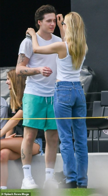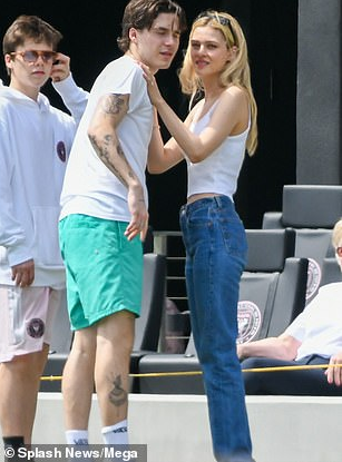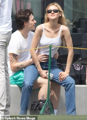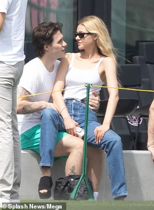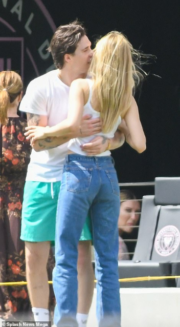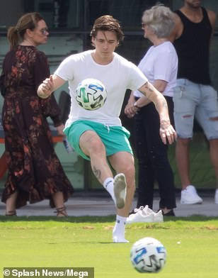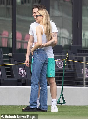 David's son Brooklyn was pictured showing off his football skills during the outing. The 21-year-old was joined by his girlfriend Nicola Peltz, with the couple putting on a romantic display as they wrapped their arms around each other.