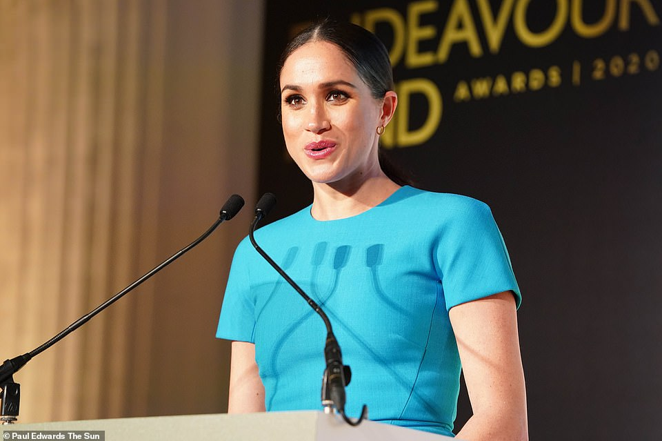 Meghan Markle has made her first public appearance in the UK since she and Prince Harry made the shock announcement that they were quitting their roles as senior royals. The Duke and Duchess of Sussex beamed as they arrived in pouring rain at the annual Endeavour Fund Awards at London's Mansion House to celebrate the sporting achievements of injured or sick servicemen and women. Meghan arrived in a turquoise blue Victoria Beckham midi dress, while Harry wore a navy suit and tie.