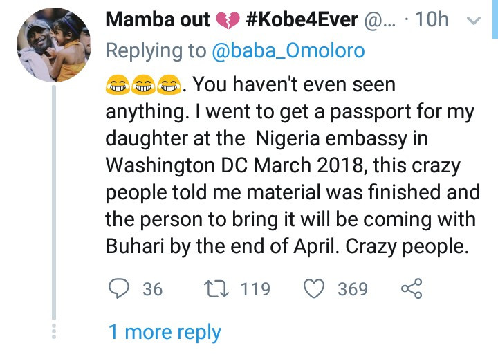 Twitter users reacted to his tweet by sharing their unique experiences in the Nigerian Embassies in different countries. @OJwalker7 wrote: "You haven't even seen anything. I went to get a passport for my daughter at the Nigeria embassy in Washington DC March 2018, this crazy people told me material was finished and the person to bring it will be coming with Buhari by the end of April. Crazy people."