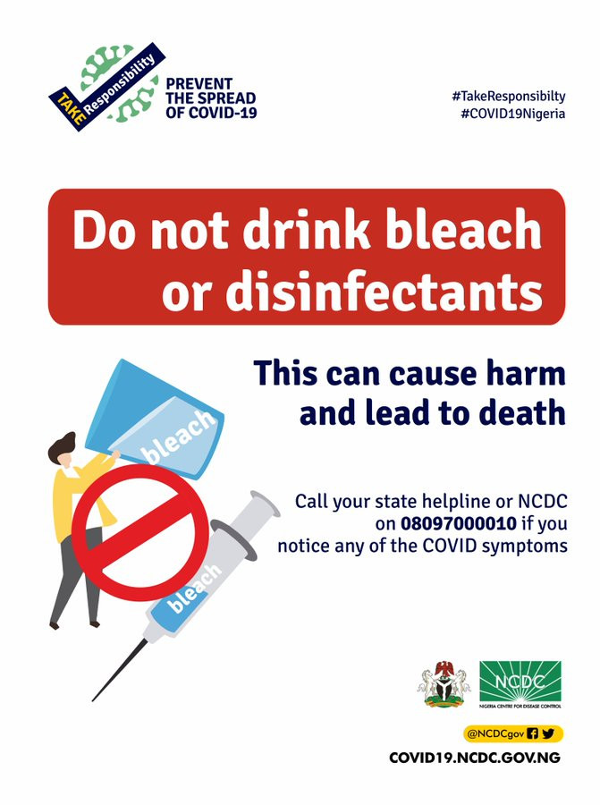 The Nigeria Center for Disease Control NCDC has warned Nigerians against drinking bleach to treat COVID-19. This advise comes days after William Bryan, acting head of the US Department of Homeland Security's Science and Technology Directorate, presented the results of US government research that indicated Coronavirus appeared to weaken more quickly when exposed to sunlight and heat. The study also claimed that bleach could kill the virus in saliva or respiratory fluids within five minutes and isopropyl alcohol could kill it even more quickly. NCDC in a post shared on its Twitter handle, warned Nigerians not to attempt to ingest bleach as Nigeria continues to battle the Coronavirus pandemic. The agency says ingesting bleach exposes a person to health complications and even death.