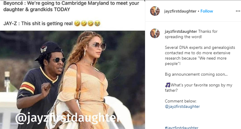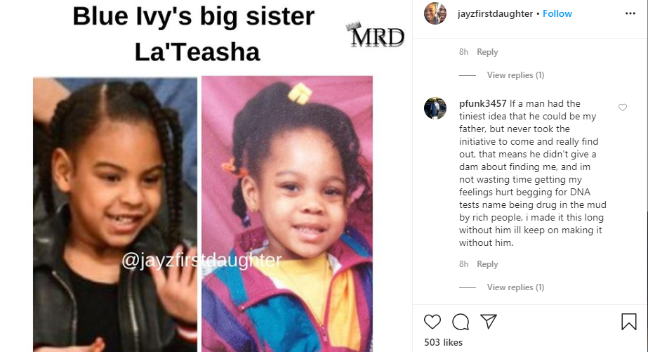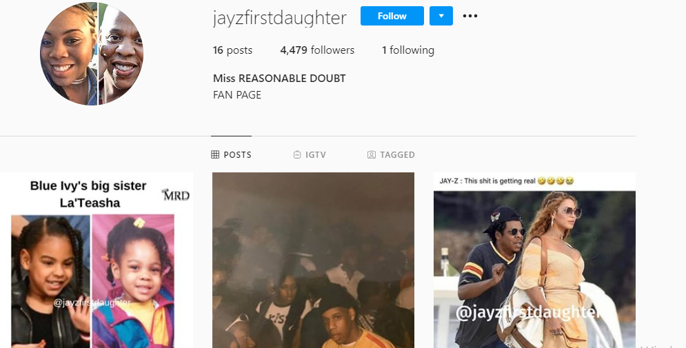La’Teasha who has her own kids and says her mum is suffering from a neurological condition, says she’s been told by her family her whole life that Jay-z is her father and her family members are online backing up their claims. Tee was born in 1990 in Cambridge, Maryland where her aunt, Terry Turner, says she introduced her mother, Lisa, to Jay-Z.Turner claims Lisa and Jay Z used to hook up at Lisa’s sister’s house before she got pregnant and gave birth to La’Teasha Macer.Lisa’s sister, Terry Turner, claimed in a Facebook post last week that Lisa tried to contact Jay-Z when he was with Roc-a-fella records but she was mocked by the person that answered the call. Early this month La’Teasha created an Instagram account with the name 'jayzfirstdaughter' and has been posting several pictures, write ups and videos saying she is Jay-Z's daughter born from an affair he had almost three decades ago.