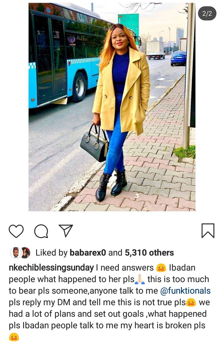 Successful Ibadan/Lagos businesswoman popularly known as Ronke Funktionals, has died. Ms. Ronke, a mum-of-two, was the CEO of a chain of boutiques called Funktionals. She allegedly slumped inside her car on Friday night in Ibadan, Oyo State. She was rushed to the hospital when she was found with her head resting on the steering wheel of her car. At the hospital, she was confirmed dead. Friends and clients have gone on Instagram and Twitter to mourn her.