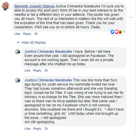 Justice saw the post and took to the comment section to apologize and also state his own side of the story. According to him, the incident happened over five years ago when he was serving. He claimed Ify came to visit his friend and roommate, a certain Tony and that Ify and the said Tony had issues so she decided to leave but did not have transport fare. He claimed he offered her money but asked for intimacy in return which she agreed to. He said he regretted his action and apologized to Ify months later.