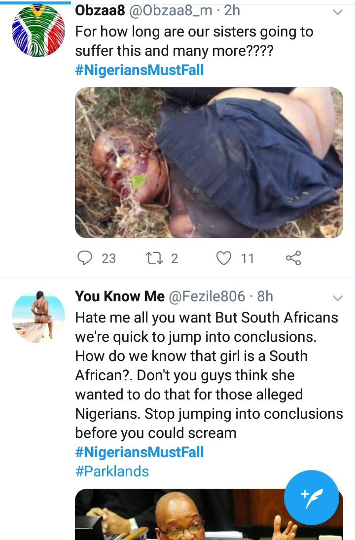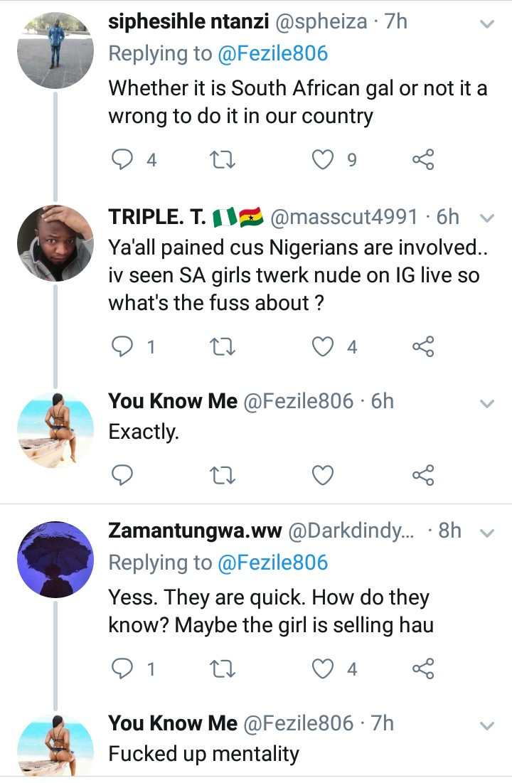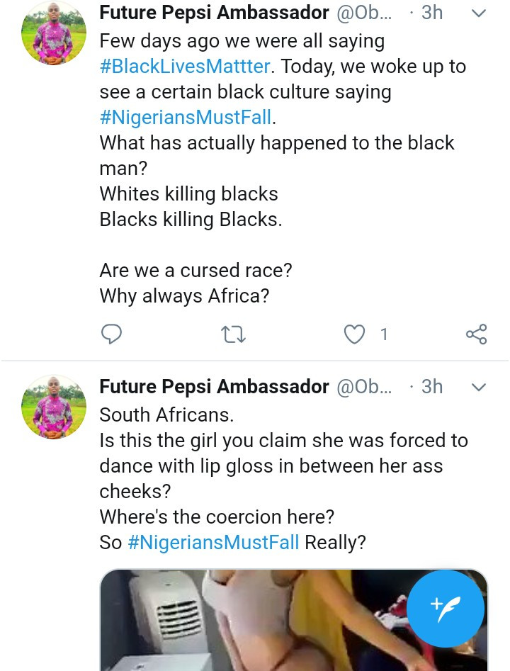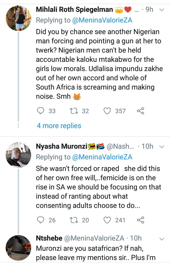 Reacting to the video, South Africans accused Nigerians of all sorts, including drugging and raping their women. Some people pointed out that the woman doesn't look like she was forced to twerk but others shut them down and stated that, even if she wasn't forced, she must have been drugged. Some South Africans came to the defence of Nigerians and accused their countrymen of xenophobia. They pointed out that femicide is on the rise as South African men kill their women and get away with it. But those people were also shut down as South Africans passed the blame to Nigerians. Nigerian Twitter users have warned Nigerians in South Africa to be careful as the hashtag could snowball into violence. Below is the video that caused outrage and reactions to it. South Africans.Is this the girl you claim she was forced to dance with lip gloss in between her ass cheeks?Where's the coercion here?So #NigeriansMustFall Really? pic.twitter.com/8TuOL2rqUn— Future Pepsi Ambassador (@Obong_Hanson) June 13, 2020