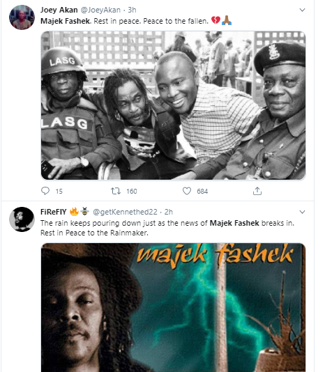 ''Thank you for sending us rain, hopefully it will take away the depression of the past few days'' - Nigerians react to to news of Majek Fashek's death