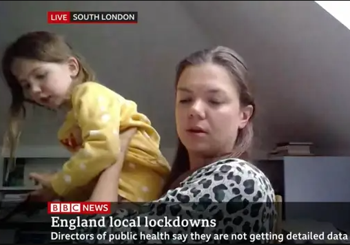 Mr Fraser had begun the interview by asking Dr Wenham about data sets that the Government had not shared with local authorities in Leicester amid the city's flare-up of cases and localised lockdown. Dr Wenham said: "It is really alarming that not all this data is being shared and not being shared equitably. "I think it reveals a broader tension between the centralisation of the response to the coronavirus outbreak and the local activities," she added. Her daughter suddenly appeared by her side wearing a yellow polka-dot dress and Dr Wenham starts apologising.
