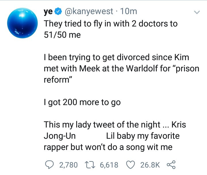 The rapper referred to his mother-in-law as "Kris Jong-Un". He also accused his wife Kim Kardashian and her mum of putting out a statement about his behavior without his approval. He further accused the Kardashians of "white supremacy" and said Kim and her mother brought two doctors to "51/50" him. 51/50 is a provision in the Welfare and Institutions Code that allows a person with a mental illness to be involuntarily detained in a psychiatric hospital for up to 72 hours. Kim Kardashian and her mother had tried to intervene when Kanye began sharing some troubling tweets at the beginning of this week (read here) but, apparently, he didn't appreciate it, hence the tweet. In the recent tweets, Kanye went on to say that he knows they may not let him see his children till they turn 18. He also took a dig at Kris by asking her to get back to him when she's done organizing her children's "Playboy" shoot. He shared screenshots of his message with Kris Jenner. In the message, he asked if she's ready to talk to him or "go to war".