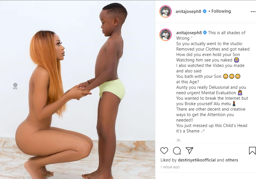Nollywood actress, Anita Joseph has slammed Ghanaian actress, Akupem Poloo for going completely naked in front of her son to wish him a happy 7th birthday. On Tuesday, June 30, the controversial Ghanaian actress and video vixen shared a naked photo of herself with her son and explained that she decided to go naked in front of her son because she gave birth to him naked. She wrote: 'I'm naked in front of you because this is how naked I was giving birth to you, so in case you find me naked lying somewhere don't pass by me but rather see me as your mom who brought you to life.' While some of her Instagram followers found the photo offensive, Anita Joseph has also expressed her displeasure over Akupem's decision to go completely nude in a photoshoot with her son to celebrate him on his 7th birthday. Reacting on her Instagram page, the actress wrote: "This is all shades of Wrong So you actually went to the studioRemoved your Clothes and got nakedHow did you even hold your SonWatching him see you naked I also watched the Video you made and also saidYou bath with your Son at this Age?Aunty you really Delusional and you need urgent Mental Evaluation You wanted to break the Internet but you Broke yourself Alu melu There are other decent and creative ways to get the Attention you needed!!You just messed up this Child’s Head it’s a Shame."
