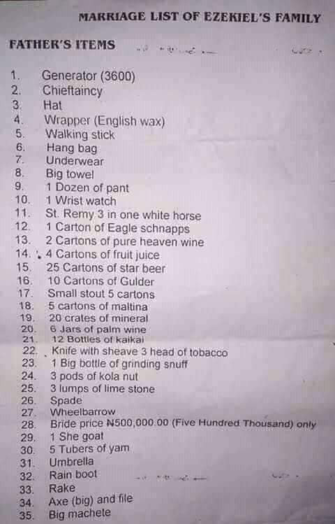 A Facebook user Maduabuchi posted a family's 3-page list of marriage items for all intending grooms. The list made by one Ezekiel's family includes items for the bride's parents, family, uncles, aunt, youths,young girls, and children.