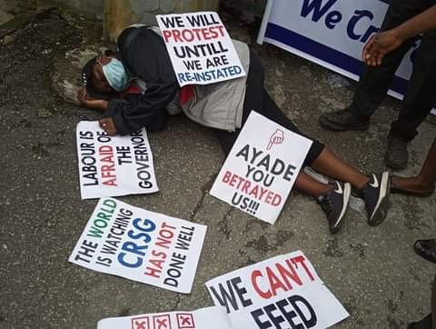 An unidentified lady slumped on Monday September 21 in Calabar while protesting against her sack by the Cross River State Government. Governor Ben Ayade had mid 2019, directed the delisting of about 2,500 names from the payroll of the Cross River State government, claiming that most of those employed between 2014 till then did not follow due process. The sacked workers on Monday blocked access to the state secretariat in protest over what they described as “unfair and illegal delisting from the state payroll.” The protesters who carried placards with inscriptions ‘we shall protest till the end’, ‘Head of Service should be sacked’’, ‘Ayade you betrayed us’, said they were tired of not hearing from the government and that the state labor union is complicit in their plights.Speaking to newsmen, Comrade Paul Ajie Abang who led the protesters said that they had initially given the state government a seven-day ultimatum to take action or face a massive protest and that it was their silence that has led to the peaceful protest. Abang disclosed that the group had met with the Head of Service and all other relevant stakeholders to iron out the matter but it seems the government is insincere and doesn’t want to act, and that the group will not back down till the right thing is done. One of the protesters who identified himself as ‘Papa’ said the protesters were part of the 2500 workers from the state who were employed and then delisted from the state’s payroll.“We are the 2500 staff of the state government who were duly employed, got their appointment letter, and then delisted from the payroll by the government. We are taking this struggle upon ourselves because labor has failed us. We are out here fighting for our rights and we have no plan of leaving here until our voices are heard.” he said."We are here to let the world know of the injustice being meted to us. for a year and one month now we have not received our salaries and the government is tossing us around.” He added. Meanwhile, it was gathered that the woman who was until her sack a staff of the ministry of health, was later revived and taken home.