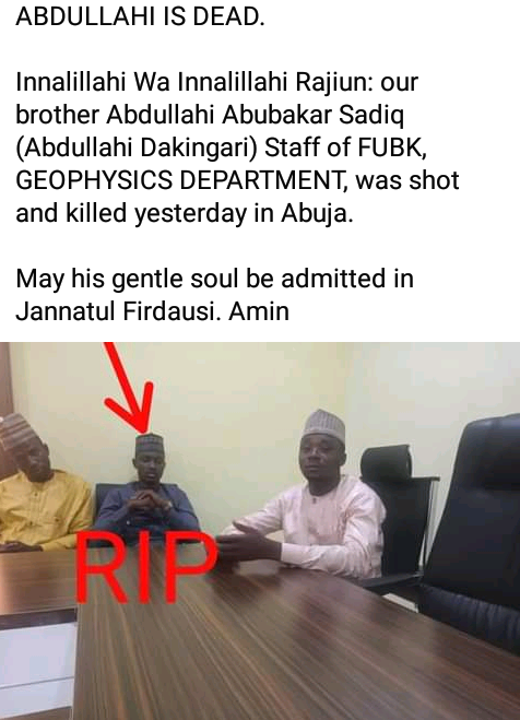 Unknown gunmen killed a 38-year-old old lecturer of the Geophysiscs Department, Federal University of Birnin, Kebbi State. It was gathered that Abdullahi Abubakar Dakingari, was killed in Abuja where he had gone to see his ailing father, who is on admission in the hospital.. An uncle to the deceased, Abubakar Mu’azu Dakingari, who confirmed the incident to Daily Trust on Friday, October 16, said the deceased was killed at Life Camp Quarters in the FCT around 10:30 pm on Wednesday, October 14 after he got trapped during a shooting spree. The late Dakingari, had since been buried according to Islamic rites in his hometown. He left behind a wife and one child.