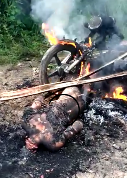 Angry mob beheaded and set five suspected armed robbers ablaze on Saturday in Akwa Ikot Effanga community, Akwabuyo Local Government Area of Cross River State. It was gathered that a 7-man gang allegedly broke into a shop at about 3am on Saturday, October 17, and made away with electronic gatgets worth thousands of naira and undisclosed amount of money.The youths of the community laid ambush for the suspects. In the process, five of them were apprehended them while two managed to escape leaving the rest to face jungle justice. A very disturbing and gory video from the scene shows the remains of the suspected robbers and a motorcycle in flames. The head of one of the suspects was missing from his neck.Meanwhile, one of the youths condemned the act, describing it as inhumane and barbaric while calling on the Nigerian police to immedately arrest the perpetrators.