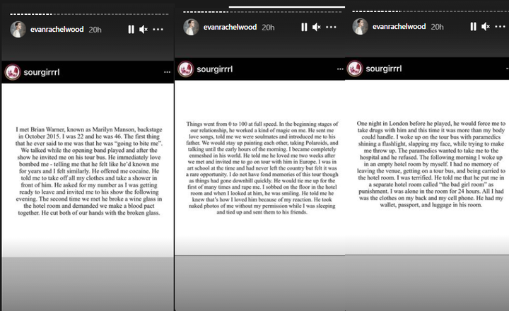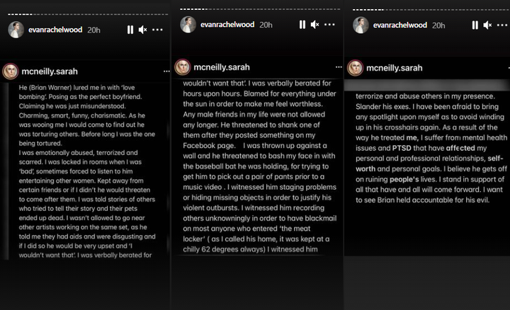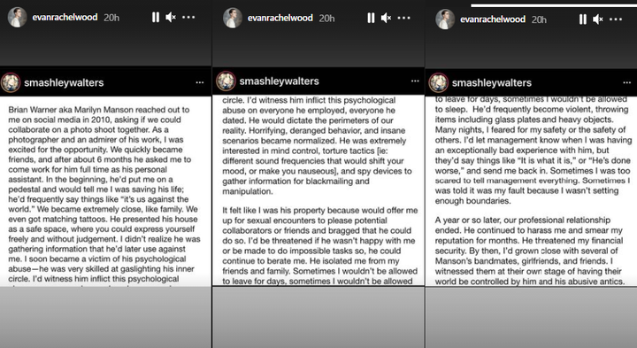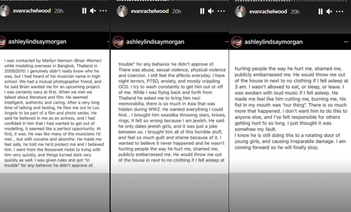 Wood and Manson dated on-and-off for years before splitting in 2010 after a failed engagement. In a show of solidarity, at least four other women; Ashley Walters, Sarah McNeilly, Ashley Lindsay Morgan and a woman who gave her name only as Gabriella posted separate statements, which Evan Rachel then shared on her Instagram page. The women detailed harrowing experiences which included sexual assault, psychological abuse, and/or various forms of coercion, violence, and intimidation. Three of the women say they had romantic relationships with him that started with him 'love bombing them' but then turned abusive.