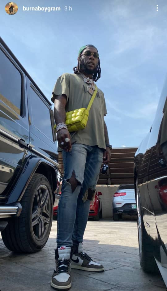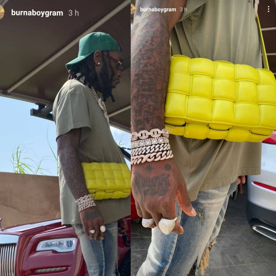 Grammy award-winning Nigerian singer, Burna Boy, stepped out rocking a Bottega Veneta bag. This particular Bottega bag is designed for females but Burna rocked the bag effortlessly. He strapped it across his shoulder as he posed for some photos which he shared on his Instastories See another one of the photos he shared below